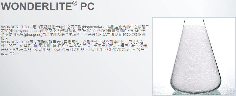 WONDERLITE®是由雙羥基化合物中之丙二酚(bisphenol-A)、碳酸鹽化合物中之碳酸二苯酯(diphenylcarbonate)由酯交換法(熔融法)反應所聚合而成的聚碳酸酯樹脂。制程中完全不使用光氣(phosgene)與二氯甲烷等含氯溶劑,生產符合FDA與UL認證的聚碳酸酯樹脂。