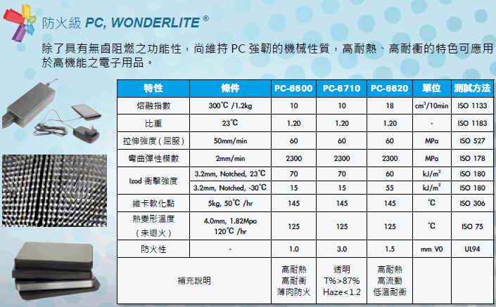 WONDERLITE® 聚碳酸酯樹脂具有優異透明性、高耐熱性、超高耐沖擊性、尺寸安定性…等等,
